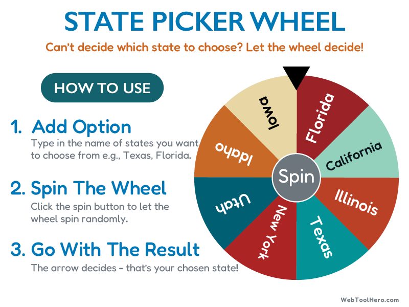 The tool uses a randomization algorithm to fairly and unpredictably choose a state from a list. After selecting a country from the dropdown, the related states automatically populate the wheel. Users can then modify the list as needed and click the βSpinβ button. The wheel spins and lands on a state, which is declared the result.